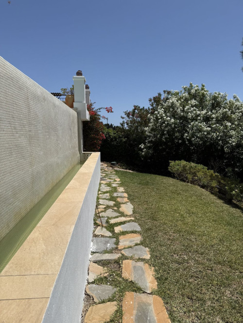 Outside, a private heated infinity pool and manicured gardens create a peaceful retreat where the green of the trees and surroundings perfectly blend in with the blue of the sea and the sky.