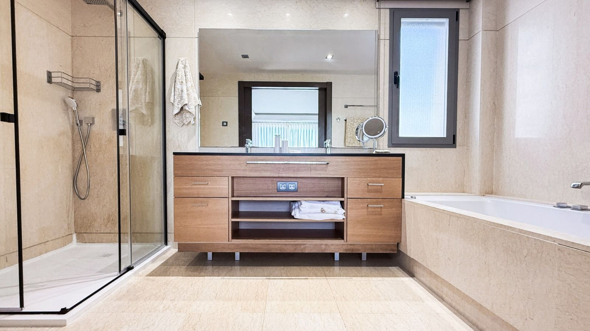 The property comprises an entrance hall leading to an open-plan kitchen seamlessly integrated with the living area, as well as a guest toilet. There are three bedrooms in total: the master bedroom features an en-suite bathroom and a private terrace, while the other two bedrooms with en suite bathrooms