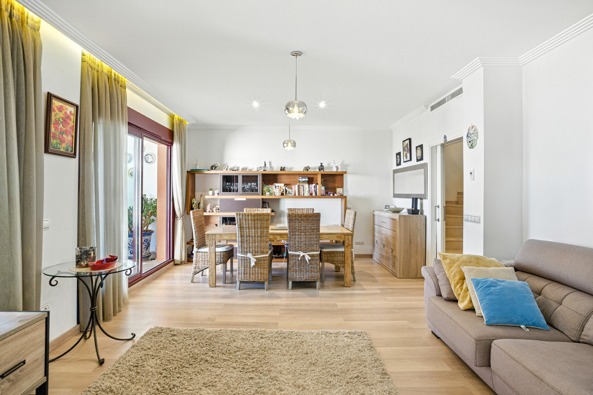 Beautiful semi-detached house in the prestigious community of Los Jaralillos, located in the sought after area of El Paraíso, Benahavís. Located near golf courses, this property offers an ideal combination of comfort, privacy and excellent location. This charming semi-detached house features a private garden and offers stunning sea views from several terraces. The main floor has a fully equipped kitchen, large living room, utility room, guest toilet and a large terrace with sea views, which offers direct access to the private garden, creating a perfect space to enjoy outdoors. On the upper floor are three rooms, one of them studio type, ideal as office, work room or additional bedroom. Two of the bedrooms have access to a terrace overlooking the sea. The master bedroom is en suite, and this floor also has an additional bathroom and a small living room.The solarium floor offers a generous terrace, perfect for sunbathing or enjoying panoramic views. The basement houses the machine room and a multipurpose room, as well as direct access to the parking lot, which provides great comfort. The property is located within a gated community, with very well maintained gardens and three communal swimming pools. Additional features include wooden floors, air conditioning, parking space and solar panels, providing energy efficiency and sustainability. This townhouse perfectly combines comfort, privacy and a privileged location, ideal both as usual residence and holiday home.