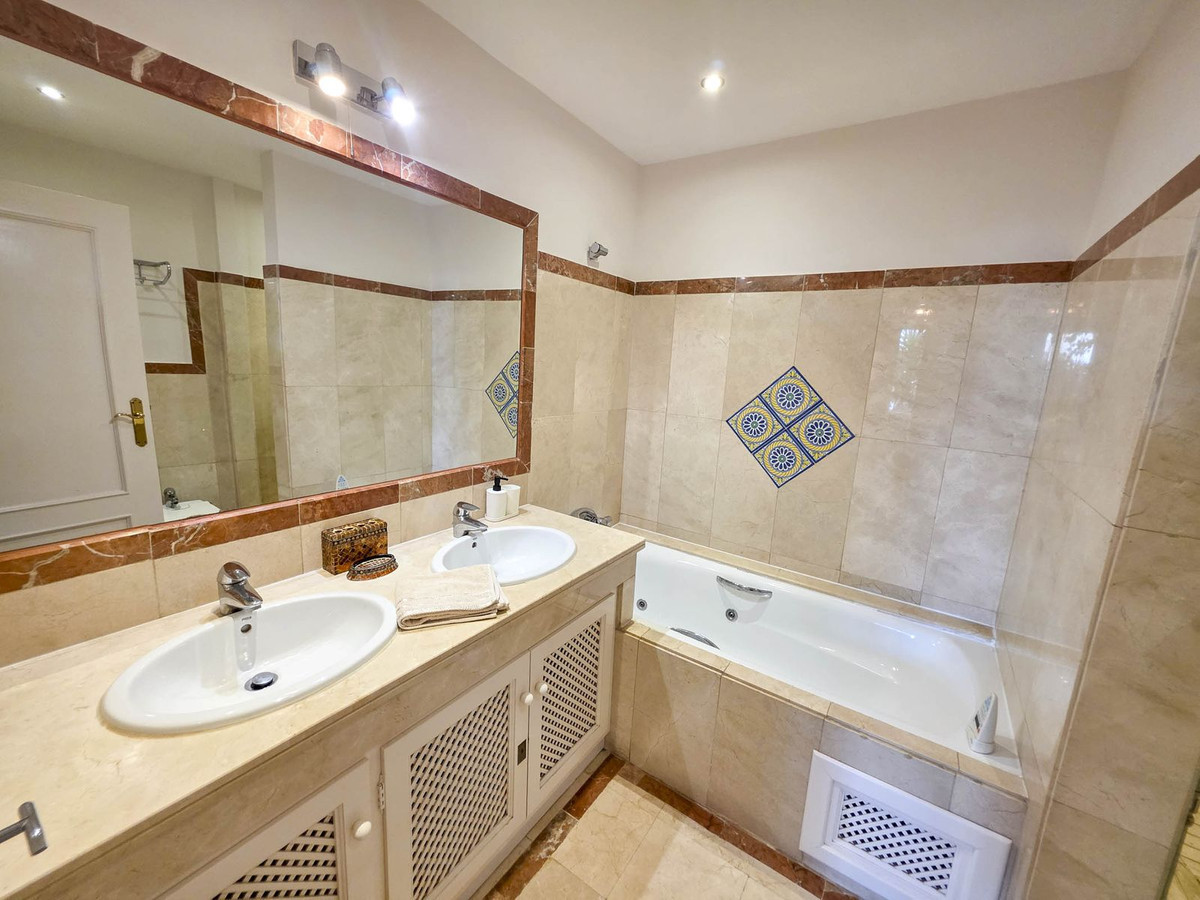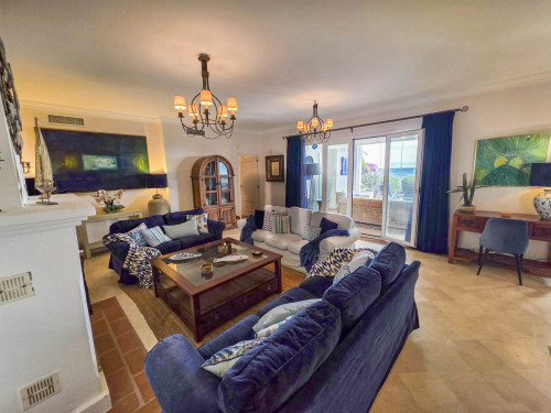 Enjoying an excellent beachfront location with direct access to the coastal path and Casares Beach, just minutes from the Finca CortesÃn Golf Course, one of the most prestigious golf courses in Spain, which has hosted numerous high-profile events, including the Volvo World Match Play Championship three times and the 2023 Solheim Cup. Just a 10-minute drive from Estepona and 4 minutes from San Luis de Sabinillas with its beautiful and picturesque Puerto de La Duquesa. Close to supermarkets, schools, and the new Estepona Hospital. This LARGE GROUND FLOOR APARTMENT WITH PRIVATE GARDEN AND SEA VIEWS has DIRECT ACCESS TO THE BEACH and is SOUTH FACING. The property boasts a spacious entrance hall leading to the spacious living-dining room with large windows that connect to the large covered terrace, which is enclosed by glass curtains and provides abundant natural light and beautiful views of the sea and the garden from inside the house. The open-plan kitchen is fully equipped and has a laundry room. These common areas have a guest toilet located next to the entrance of the house. The three bedrooms of the home are distributed from the living room area. The two guest bedrooms have large built-in wardrobes and large windows overlooking the beautiful communal gardens. Adjacent to them is a full bathroom with a bathtub and underfloor heating. The spacious master bedroom has a dressing area and an en-suite bathroom with a whirlpool bathtub, separate shower, double sinks, and underfloor heating. This bedroom also has direct access to the private terrace. The home enjoys beautiful and well-maintained common areas with several swimming pools and ideal gardens. GREAT OPPORTUNITY TO EXPERIENCE THE LUXURY OF HAVING YOUR HOME ON THE SHORES OF THE MEDITERRANEAN SEA!!