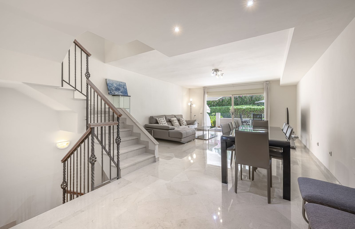 Elegant Family Townhouse in the Heart of Nueva Andalucía, Marbella's Golf ValleyWelcome to this beautifully maintained and spacious townhouse, ideally situated in the prestigious Golf Valley of Nueva Andalucía. This four-level home combines comfort, style, and convenience—perfect for family living or as a luxurious holiday retreat.The main floor welcomes you with sunny patio, leading into a large, fully equipped independent kitchen. The generous open-plan living and dining area flows seamlessly onto a west-facing terrace and private garden, with direct access to the community swimming pool—ideal for relaxing or entertaining. A guest toilet adds practicality to this level. On the first floor, you’ll find two generously sized bedrooms, each with its own ensuite bathroom and private terrace, offering peaceful retreats with ample natural light. The top floor hosts a spacious bedroom featuring an ensuite bathroom, a large terrace with panoramic views of the golf course, and a sunny west-facing solarium for tranquil evenings.The expansive basement with natural light is a versatile space, perfect for -another bedroom, home cinema, playroom, office, or music studio. It also includes a guest bathroom, a laundry area, and direct access to an underground private garage with space for two vehicles. The house is constructed with the best quality materials and finishings. Located in an exclusive and private complex with very few neighbors. Enjoy tranquility in the beautifully landscaped gardens, swimming pool and gym area, Just a short drive to Puerto Banús and Marbella, it’s an unbeatable location for golf lovers and those seeking the best of Costa del Sol living. Move-in ready—don’t miss this exceptional opportunity!